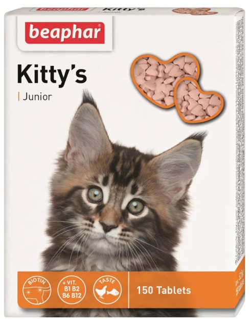 „Kitty’s Junior“ koos biotiiniga on vitamiinid maiustuste kujul kassipoegadele alates 6 nädala vanusest. Ideaalne täiendus noore looma igapäevasele toidule. See sisaldab terve arengu jaoks olulist vitamiinide ja mineraalide kompleksi. Biotiin tagab teie kassipoegadele terve naha ja läikiva karvkatte, samuti tugevdab nende küüniseid.