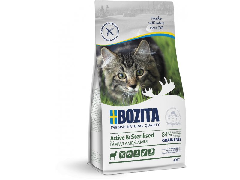 Täissööt täiskasvanud (al. 1 eluaastast) aktiivsetele steriliseeritud kassidele, kelle energiavajadus on keskmisest kõrgem. Sööt on teraviljavaba.Aktiivsem liikumine nõuab kehalt rohkem, mistõttu sisaldab antud sööt looduslikke tervist hoidvaid beeta-glükaane, kondroitiinsulfaati ja glükosamiini, et hoida kassi liigesed vormis.Sööda muudab eriti maitsvaks vabakasvatusega Rootsi lambaliha.*Kasvuhormoonid puuduvad*Teraviljavaba koostis*GMO vaba*Ei sisalda maitsetugevdajaid, lõhna- ja värvaineid, säilitusaineid ega suhkrut*Värske Rootsi tooraineKoostis: Kana 24% (kuivatatud kana 20%, kanapuljong 4%), lammas (värske lambaliha 12%), kuivatatud kartul, hernetärklis, luuüdi 13%, kuivatatud veisevalk 6%, kuivatatud seavalk 5%, lignotselluloos 4%, kartulivalk, kalajahu 2%, mineraalid, siguriinuliin (FOS 0,63%), kuivatatud peedikiud, mannanoligosahhariidid (MOS 0,2%), pärm (ß-1,3/1,6-glükaanid 0,1%), glükoosamiin 0,05%, kondroitiinsulfaat 0,004%.Lisandid (kg kohta): Toitainelised lisandid: A-Vitamiin 25000RÜ, D3-vitamiin 1800RÜ, E-vitamiin 650mg, L-karnitiin 50mg, tauriin 2000mg, DL-metioniin 2000mg, vask (vask(II)sulfaat, pentahüdraat) 10mg, mangaan (mangaan(II)oksiid) 7mg, tsink (tsinksulfaat, monohüdraat) 70mg, jood (kaltsiumijodaat, veevaba) 0,5mg, seleen (seleenipärm) 0,2mg,
