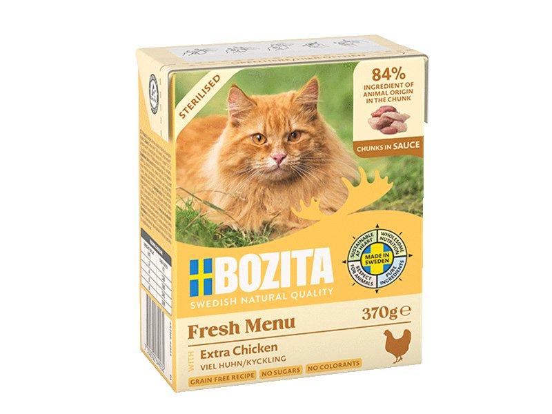Bozita Sterilised Extra Chicken on tasakaalustatud täissööt täiskasvanud kassidele. Toit on kohandatud steriliseeritud kassidele, kelle energiavajadus on väiksem, mistõttu sobib see ka vanematele ja ülekaalulistele kassidele. Kõrge lihasisaldus (kuni 84%) ja värske tooraine tagavad madala rasvasisalduse, mille tulemuseks on loomulikult tasakaalustatud vitamiinide ja mineraalainete tase. Retsept on teraviljavaba ja ei sisalda lisatud suhkruid ega värvaineid ning on rikastatud tervist edendavate omadustega looduslike pärmi beeta-glükaanidega.*100% teraviljavaba