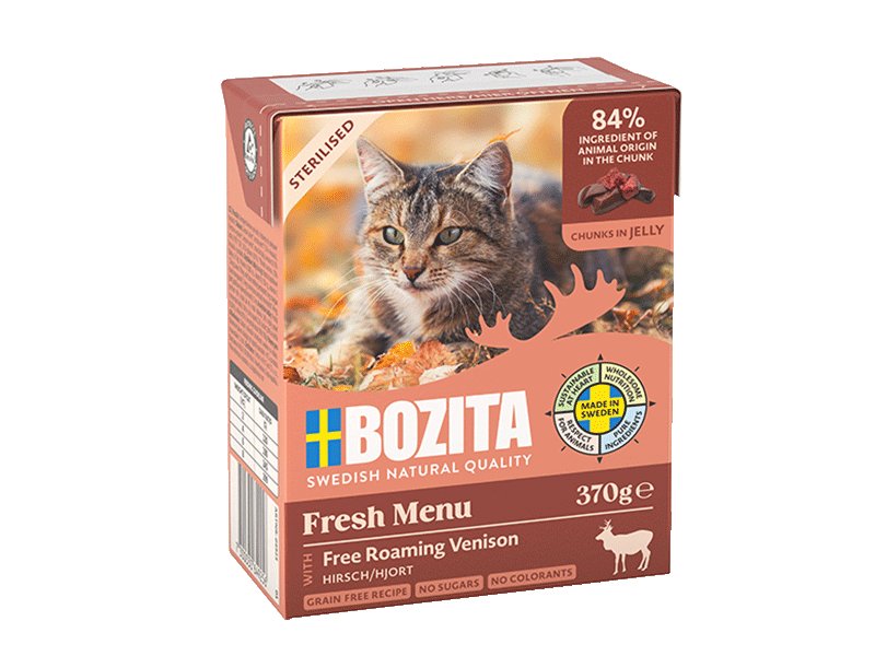 Bozita Sterilised Free Roaming Venison on tasakaalustatud täissööt täiskasvanud kassidele. Toit on kohandatud steriliseeritud kassidele, kelle energiavajadus on väiksem, mistõttu sobib see ka vanematele ja ülekaalulistele kassidele. Kõrge lihasisaldus (kuni 84%) ja värske tooraine tagavad madala rasvasisalduse, mille tulemuseks on loomulikult tasakaalustatud vitamiinide ja mineraalainete tase. Retsept on teraviljavaba ja ei sisalda lisatud suhkruid ega värvaineid ning on rikastatud tervist edendavate omadustega looduslike pärmi beeta-glükaanidega.*100% teraviljavaba