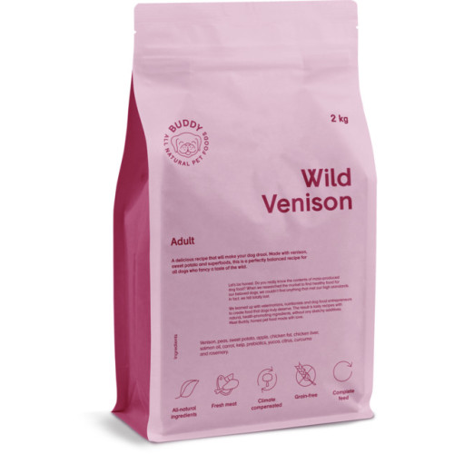 Buddy kuivtoit koertele hirvelihaga. Täissööt täiskasvanud koertele, sobib ka tundliku seedimisega koertele. Valmistatud kompromissitu seguna, mis sisaldab 60% kvaliteetset hirveliha ning 40% toitvaid köögivilju, puuvilju ja supertoite. See täissööda retsept pakub maitseelamust ja toitainelist tasakaalu, mis on eriti õrn nii seiklushimulisele kui ka tundlikule koerale.