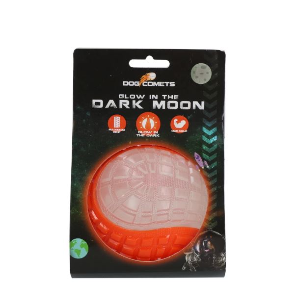 Komeet Glow In The Dark Moon Ball pakuvad tundide kaupa lõbu ka pimedas! Seda seetõttu, et palli läbipaistev osa helendab pimedas, muutes selle hästi nähtavaks. Ideaalne pimedatel talvepäevadel või kui soovite koeraga hilisõhtul mängida. See pall ujub ka vee peal ja põrkab suurepäraselt. Keskel asuv squeaker pakub mängimise ajal lisastimulatsiooni.