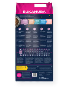 Eukanuba kuiv koeratoit sisaldab rikkalikult värsket kanaliha ja on ideaalne suurt tõugu kutsikatele vanuses 1 kuni 12 kuud (giganttõugude puhul 1 kuni 14 kuud). Valitud koostisosad tagavad kohandatud toitumise, et toetada teie kutsika kasvu ja arengut. Eukanuba kuivtoit sisaldab DHA-d, mis stimuleerib kutsikate õppevõimet ja koolitatavust. Toidus sisalduv kaltsium toetab luude arengut. Kohandatud kiusegu, mis sisaldab prebiootikume (FOS), mannooligosahhariide (MOS) ja peedimassi, toetab tervet seedimist. See sisaldab ka antioksüdante – vitamiine E ja C, mis aitavad toetada koera immuunsüsteemi. Tänu looduslikele oomega-6 ja -3 allikatele toetavad Eukanuba krõbinad tervet nahka ja säravat karvkatet. Eukanuba ainulaadne kuivtoidu kuju aitab hoida hambad kaua puhtad ja terved. Toit on 100% täisväärtuslik ja tasakaalustatud. Täiustatud toitumine suurt tõugu kutsikatele, et toetada optimaalset füüsilist vormi ja heaolu kogu eluks.