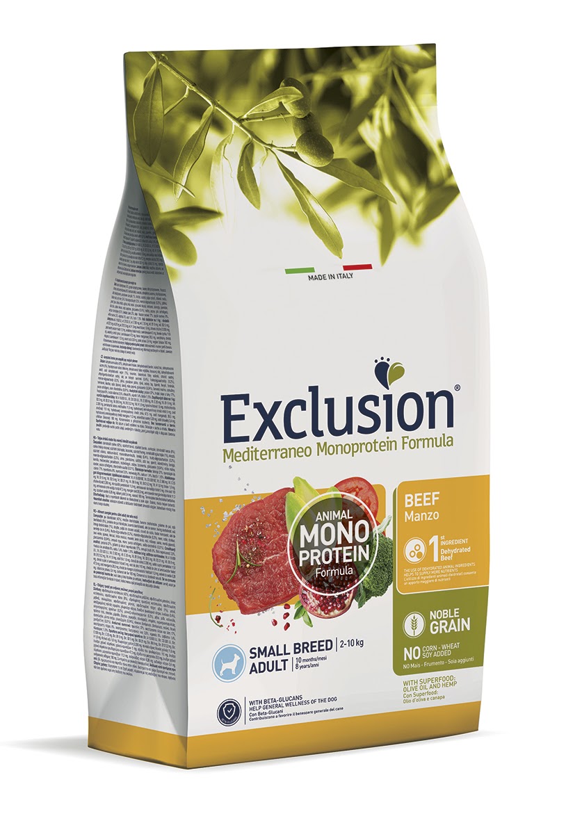 Veiselihaga täistoit väikest kasvu (1-10kg) täiskasvanud koertele. Exclusion Mediterraneo Monoprotein Formula – Noble Grain on täisväärtuslik ja tasakaalustatud toit, mis sisaldab vaid üht loomse valgu allikat – veiseliha.