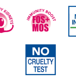 Kana (värske 8%, dehüdreeritud 30%), mais, riis, loomne rasv (kanaõli), hüdrolüüsitud loomne valk, peedi viljaliha, kala (dehüdreeritud lõhe), kalaõli (lõheõli), õllepärm (MOS-i ja vitamiini allikas) B12), FOS (500 mg / kg), tauriin, yucca schidigera.