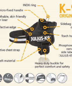 K9 traksidel on seljal käepide, mis võimaldab koera kindlalt kinni hoida ja tõsta. Kõhurihmal on tugevast plastikust pannal, rindkererihm on reguleeritava kinnitusega. Koer rinnale jääval rihmal on helkurriba, mis teeb koera pimedal ajal nähtavaks ja suurendab nii koera ja sinu turvalisust hämaras.