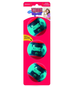 KONGi sini-punased Squeezz Action pallid teevad häält ja põrkavad hästi. Squeezz Action mänguasjad on täiesti uus KONGi sari. Selle sarja tooted on tehtud hästi dünaamilisest kummist ja naljakad kujud teevad mängud koos koeraga nauditavaks nii koerale kui ka inimesele, sest koerad armastavad taga ajada ja püüda tugevalt põrkavaid asju.