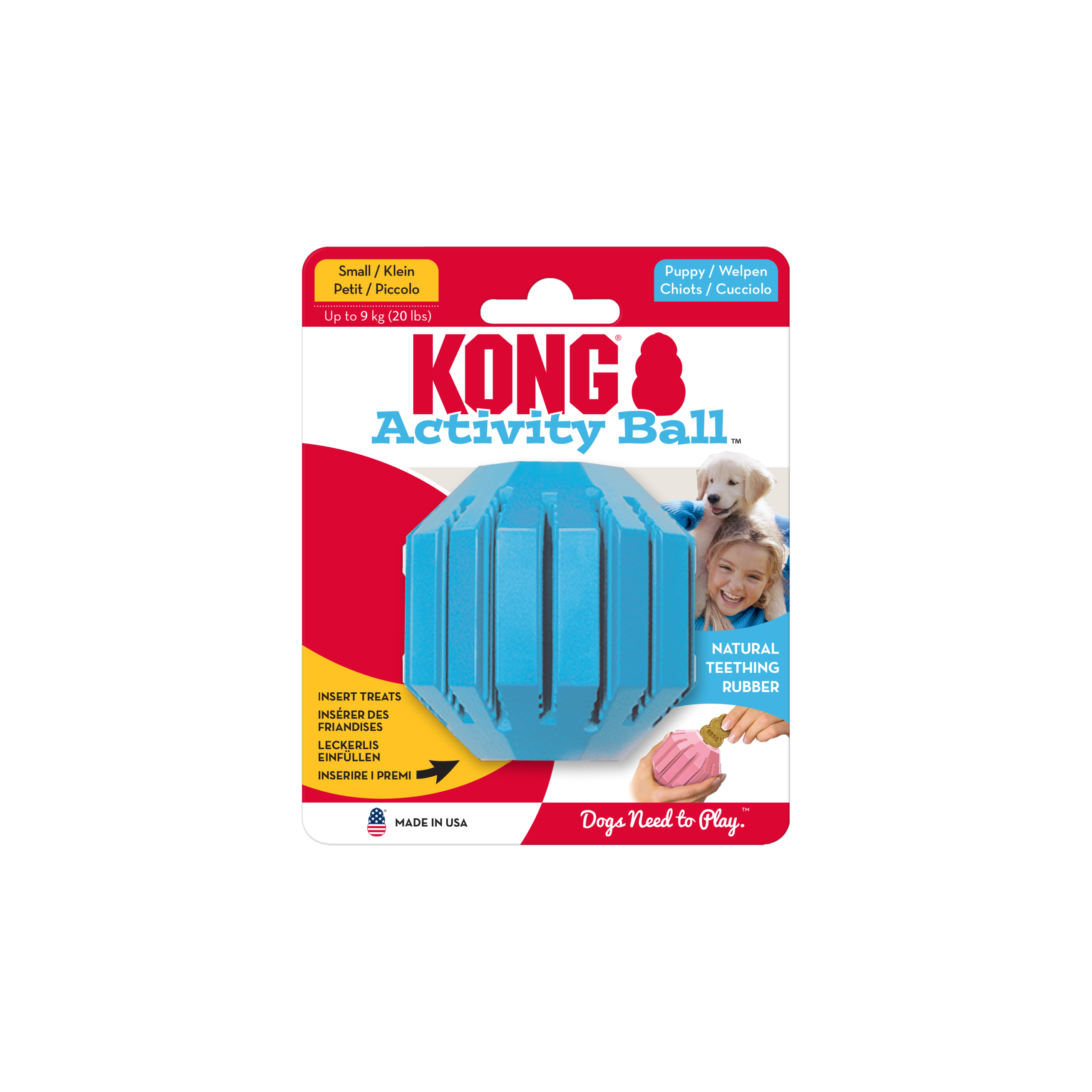 KONG Puppy Activity Ball ™ KONG Classic ainulaadsest kutsikakummist (Puppy Rubber) valmistatud pall täidab sinu kutsika närimisvajaduse, leevendades samal ajal valu, mis hammaste vahetumise ajal tekkida võib. Mänguasja sisse saab peita maiusi või krõbinaid. Lisaks saab mänguasja täita nt pasteediga. Maiusega täidetuna annab see pall su kutsikale ka pikaks ajaks tegevust ja leevendab niimoodi võimalikku üksiolemise stressi.