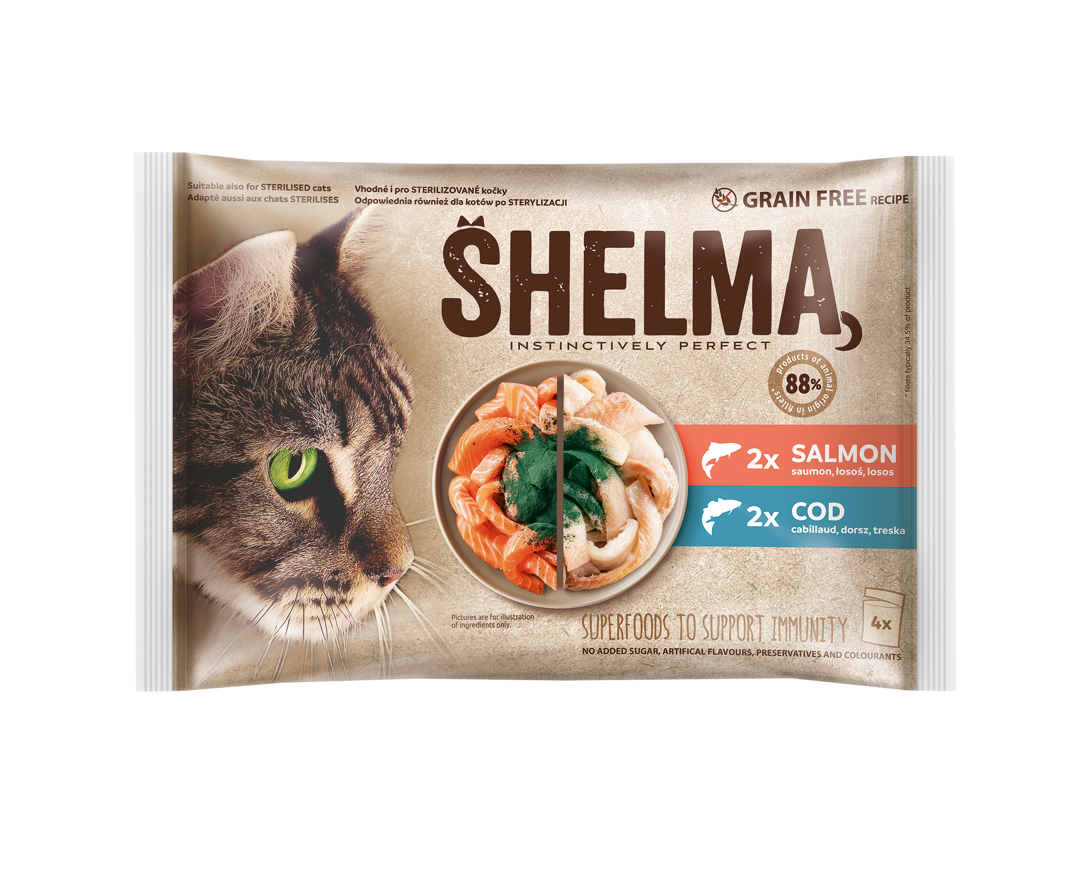 Shelma teraviljavabad kassieine aurutatud lõhefileed-ja tursafileed spirulinaga kastmes 4x85g .Teraviljavaba täissööt täiskasvanud kassidele, sobib ka steriliseeritud kassidele.lma lisatud suhkruta, kunstlike lõhna- ja maitseainete, säilitus- ja värvaineteta Koostis: lõhe ja spirulinaga: liha ja loomsed tooted vastavalt tootele (74% filee),kala ja kalatooted (14% lõhefilee,) *),mineraalid, taimse päritoluga kõrvalsaadused (0,4% inuliin), spirulina 0,05%.tursa ja spirulinaga: liha ja loomsed tooted vastavalt tootele (74% filee),kala ja kalatooted (14% lõhefilee,) *),mineraalid, taimse päritoluga kõrvalsaadused (0,4% inuliin), spirulina 0,05%* filee osakaal 34,5% tootestAnalüütilised koostisosad: niiskus 81,0%, toorvalk 10%, rasvasisaldus 3,5%, toortuhk 2,5%, kiudained 0,4%.Mikroelemendid 1 kg kohta:: D3-vitamiin 160 RÜ, E-vitamiin 100 mg, tsink (tsinksulfaatmonohüdraadina) 10 mg, mangaan (mangaani (II) oksiidina) 2 mg, vask (vask (II) sulfaatpentahüdraadina) 1,2 mg, jood (veevaba kaltsiumjodaadina) 0,2 mg, tauriin 520 mg, biotiin 100 μg.Toitmisjuhis : soovituslikud kogused: Toitmisjuhised on soovituslikud, individuaalsed vajadused sõltuvad kassi vanusest, füüsisest ja aktiivsusest.Keskmise suurusega kass kehakaalus 3 kuni 5 kg vajab 200 kuni 400 g toitu päevas alates kahest toidukorrast.