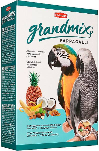 Padovan Pappagalli Grandmix täissööt suurtele papagoidele. Täissööt koosneb erinevatest seemnetest ja teraviljadest, kuivatatud puuviljadest ja pähklitest ning lisatud on ka erinevaid vitamiine. Koostis: seemned (maapähkel 9%), teraviljad, puuviljad (jaanikaun 5,5%, banaan 1%, ananass 0,5%), pähklid (sarapuupähklid 1,5%, mandel 1,5%, kookos 0,5%), juurviljad. Lisatud 1kg kohta: vitamiin A 6000 IU, vitamiin D3 750 IU, vitamiin E 10 mg, värvained. Kasutamine: panna söödanõusse ja lasta lindudel isu järgi süüa.Hoida värske ja puhas joogivesi alati saadaval. Säilitamine: hoida kuivas ja jahedas. Kõlblik kuni: vaata pakendilt. Tootja: Valman S.R.L., Itaalia. Maaletooja: AS Magnum Veterinaaria